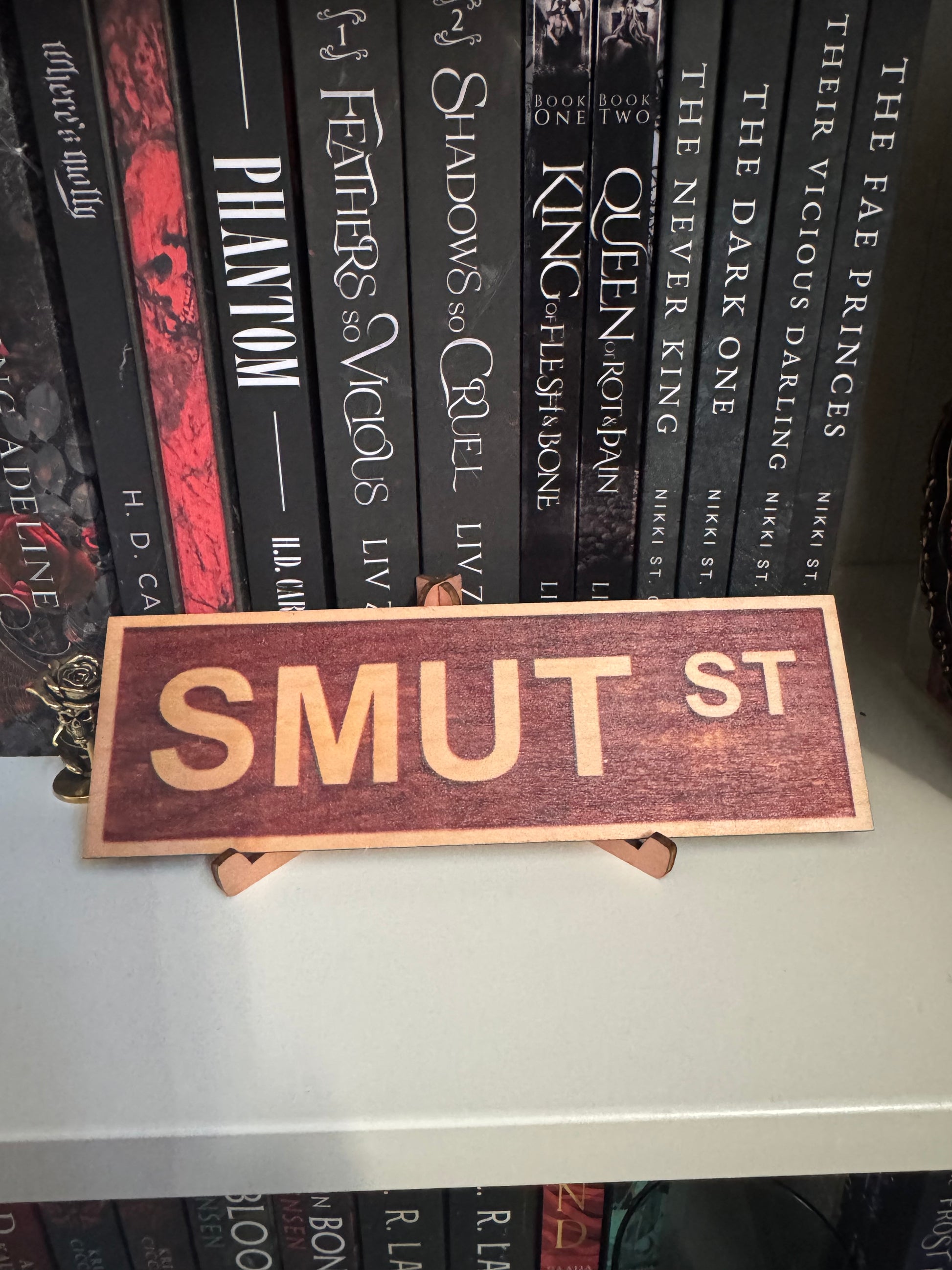 Elevate your bookshelf with the SMUT ST wood look sign. Crafted with a rustic wood look finish, this bookshelf signage adds a touch of elegance to your space. Perfect for organizing your books or labeling different sections of your shelves, the SMUT ST sign is both functional and stylish.